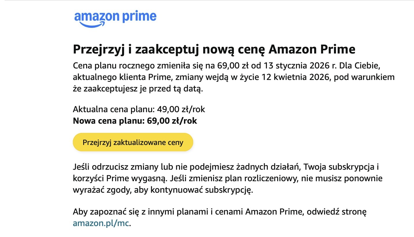 Amazon zaktualizował swoją stronę pomocy o nowy cennik już pod koniec grudnia, jednak dopiero teraz do Polaków zaczęto wysyłać informacje o nadchodzących podwyżkach bezpośrednio drogą mailową. W wiadomościach firma informuje, iż roczna subskrypcja Amazon Prime wzrośnie z 49 zł do 69 zł, a miesięczna opłata wyniesie 15,50 zł zamiast dotychczasowych 10,99 zł. Zmiany obejmują zarówno nowych, jak i obecnych użytkowników, przy czym ci drudzy muszą zaakceptować nowe warunki, aby zachować ciągłość usługi.