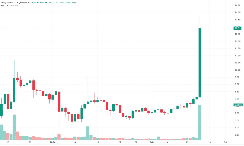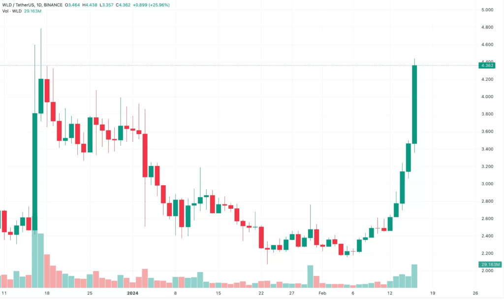 W następstwie ogłoszenia OpenAI, altcoiny takie jak Worldcoin (WLD), Livepeer (LPT) i SingularityNET (AGIX) odnotowały znaczące zyski. Kurs LPT wzrósł o ponad 60%, a następnie ustabilizował się na poziomie 54%, osiadając na poziomie 12,5 USD. AGIX również gwałtownie wzrósł o 21%, osiągając kurs 0,38 USD. Tymczasem WLD odnotował 35% wzrost, dobijając w rejony 4,36 dolarów za monetę.