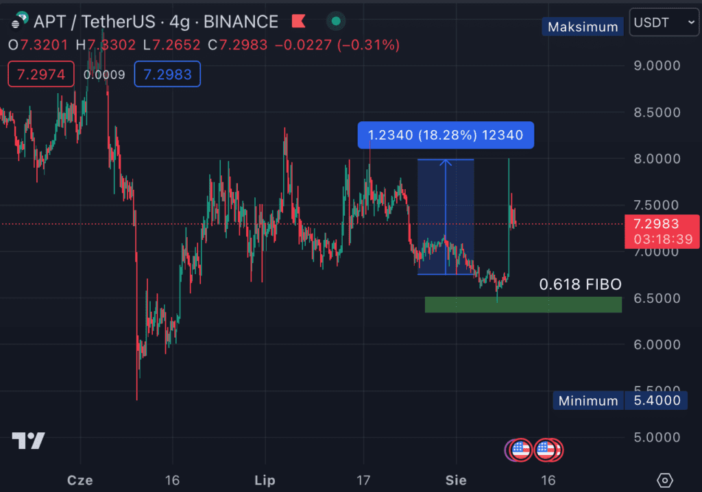 Wiadomość, która została ogłoszona 9 sierpnia o godzinie 12:30 UTC, natychmiastowo spowodowała wzrost ceny APT o około 18% do poziomu prawie 8 dolarów w ciągu niecałej godziny. Następnie token ochłodził się do okolic 7,5 – 7,2 USD. Chwilę wcześniej APT „zaliczył” strefę 0.618 mierzenia Fibo. Mimo wzrostu ceny, token APT jest wciąż o 62,9% poniżej swojego ATH wynoszącego 19,92 USD, osiągniętego 26 stycznia, zgodnie z danymi z CoinMarketCap.