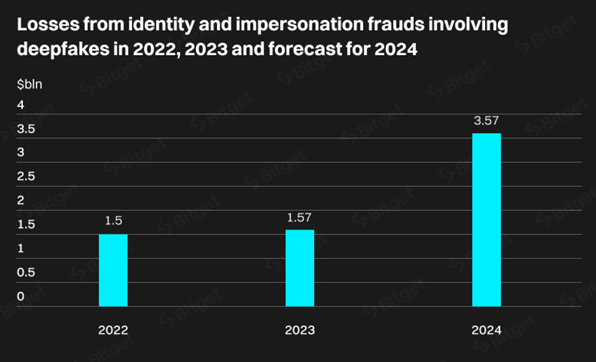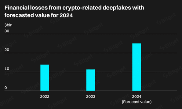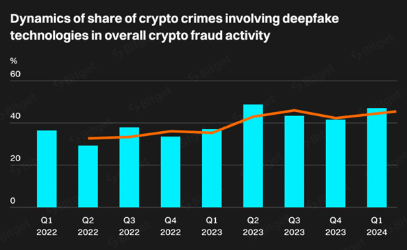 Udział przypadków kradzieży tożsamości przy użyciu deepfakes w latach 2022-2024 w stosunku do pozostałych działań cyberprzestępczych, źródło: raport Bitget ResearchJeśli nie zostaną wprowadzone skuteczne środki zaradcze, udział przestępstw związanych z technologią deepfake w przestrzeni kryptowalutowej może sięgnąć 70% wszystkich przypadków do początku 2026 roku. Przesłankami stojącymi za tak pesymistycznym scenariuszem jest gwałtowny rozwój mocy przerobowych związanych z AI, wahania rynkowe oraz oraz szybkie i pochopne podejmowanie decyzji inwestycyjnych przez inwestorów i speklulantów kryptowalutowych.