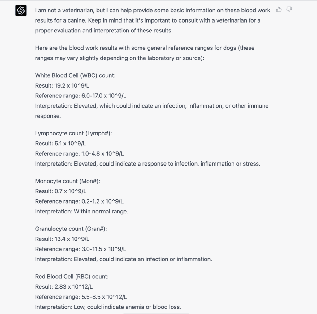 Najbardziej imponującą częścią było to, jak dobrze bot czytał i interpretował wyniki badań krwi. Po prostu przepisałem wartości testu CBC z kartki papieru, a on podał krok po kroku wyjaśnienie i interpretację wraz z zakresami referencyjnymi (które potwierdziłem jako poprawne).