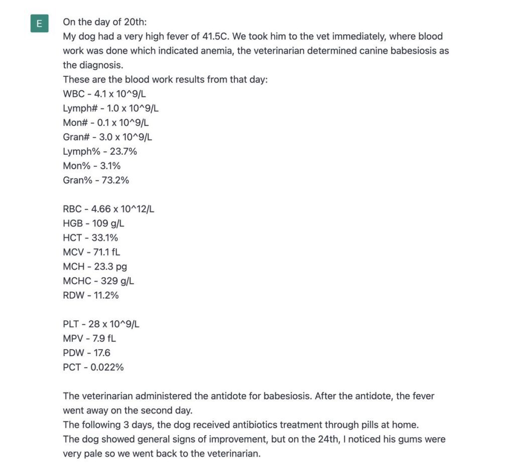 Po tym, jak u mojego psa zdiagnozowano chorobę przenoszoną przez kleszcze, weterynarz rozpoczął odpowiednie leczenie i pomimo poważnej anemii, jej stan wydawał się stosunkowo dobrze poprawiać.