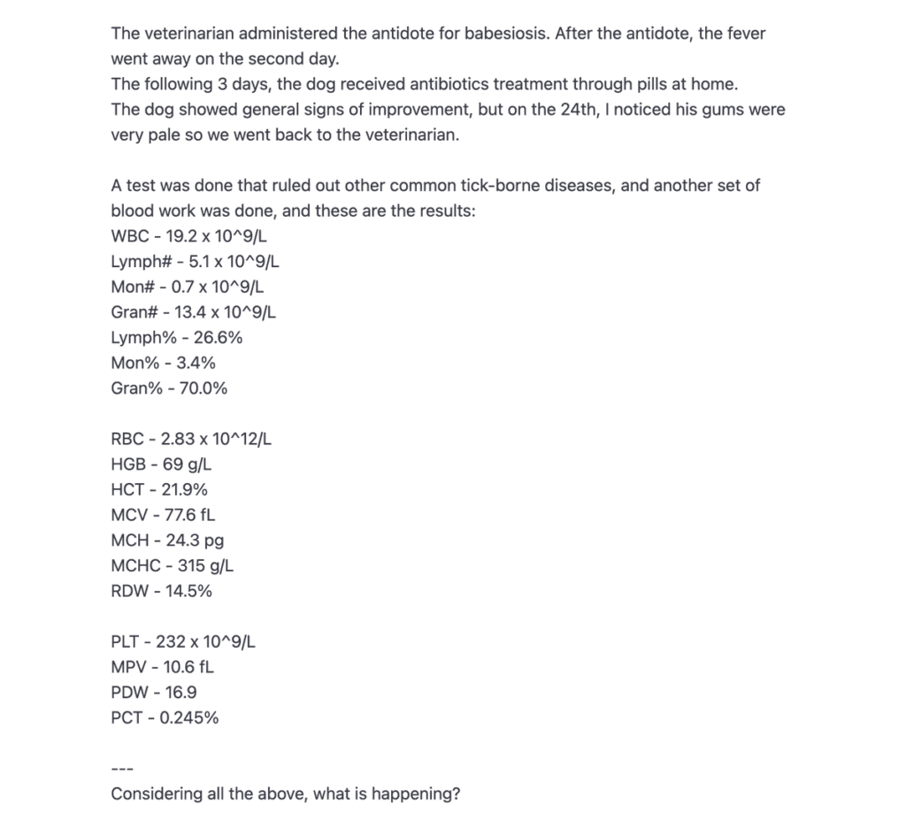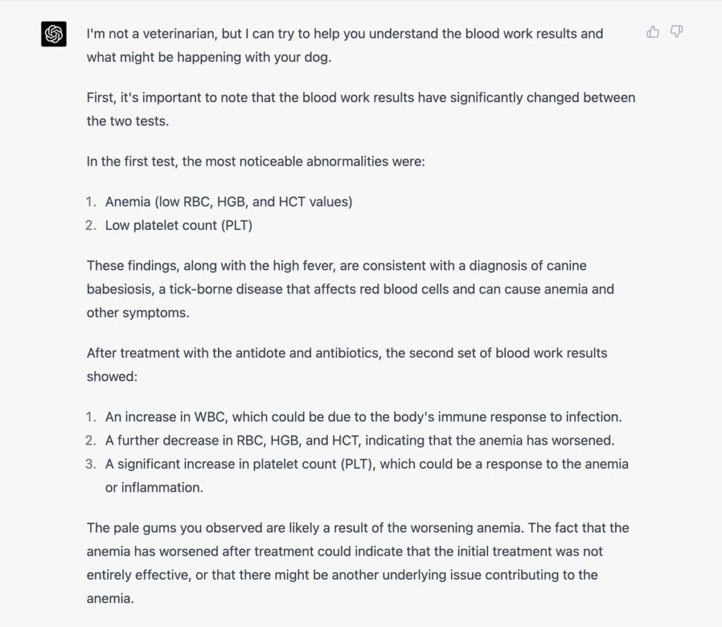 Po wielu innych badaniach diagnoza została potwierdzona. GPT-4 miał rację. Rozpoczęliśmy u psiaka odpowiednie leczenie i teraz już prawie w pełni wyzdrowiała.