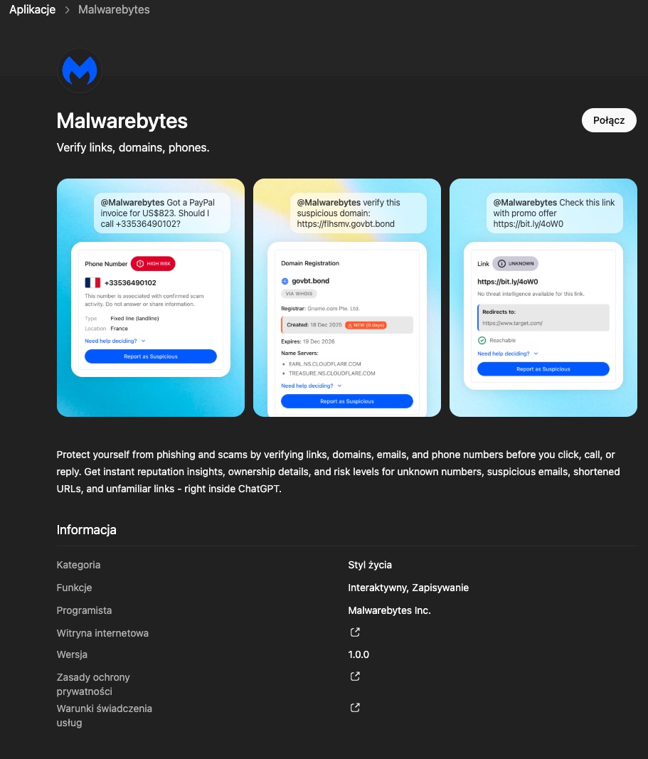 Narzędzie jest w stanie zweryfikować, czy dany link widnieje w rejestrach zagrożeń, śledzi ukryte przekierowania i wykrywa nowe domeny. Pozwala też zweryfikować, czy numery telefonu oraz adresy nadawców znajdują się w bazach danych oszustw czy pochodzą z regionów, z których często wysyła się oszustwa. Malwarebytes w ChatGPT weryfikuje również legalność domeny.