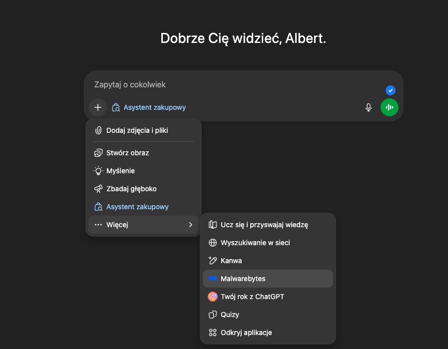 Aby skorzystać z rozwiązania, w dowolnym czacie, należy kliknąć ikonę plusika, wybrać sekcję Więcej i znaleźć aplikację Malwarebytes. Następnie można przejść do sprawdzania treści w ChatGPT.
