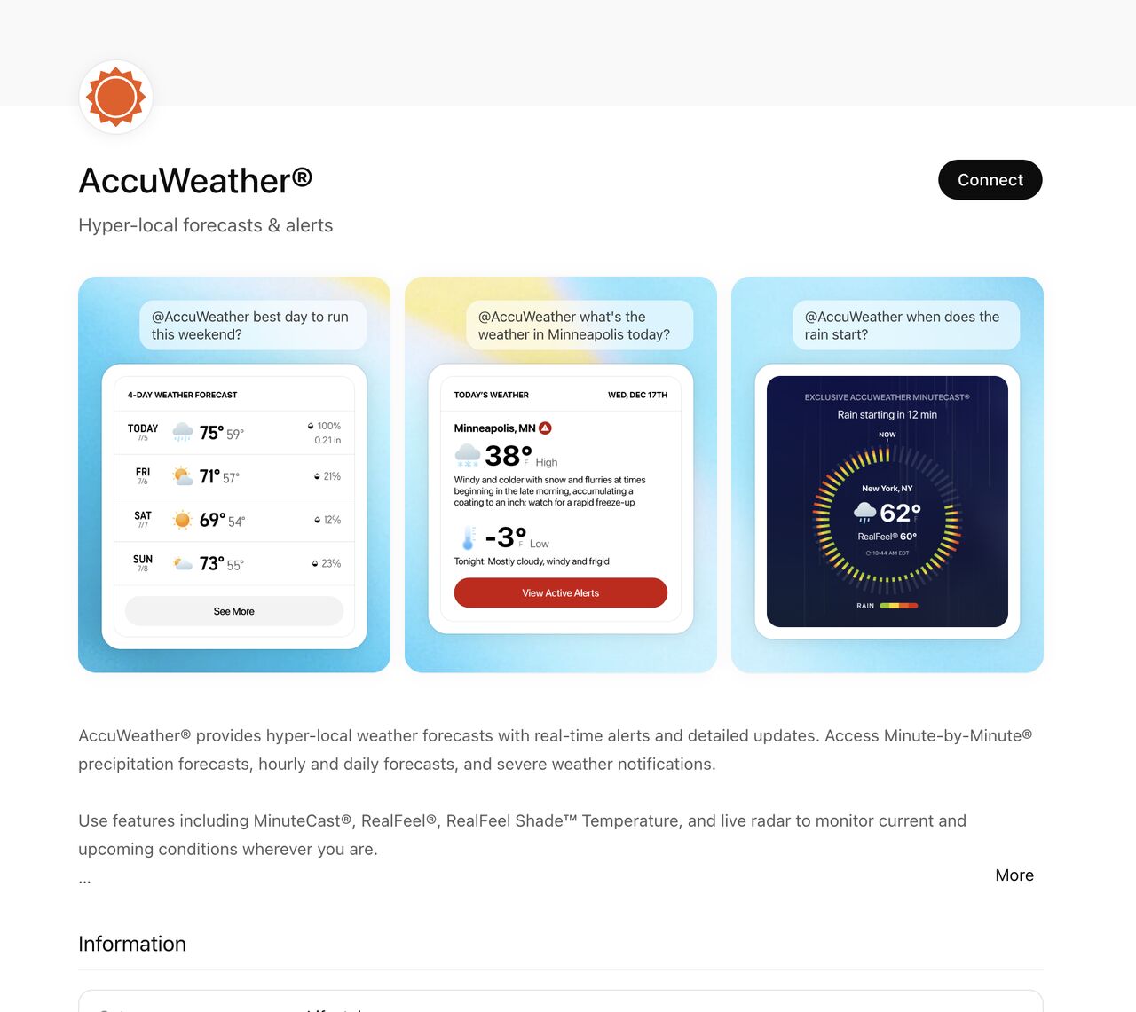 Firma stawia na niezawodność, zwłaszcza w nagłych sytuacjach kryzysowych. Uruchomienie aplikacji AccuWeather w ChatGPT zapewnia, iż informacje o pogodzie, które otrzymują użytkownicy, są najdokładniejsze, z jasnym, konkretnym i przydatnym komunikatem, który okazuje się łatwiejszy do zrozumienia niż u innych dostawców.