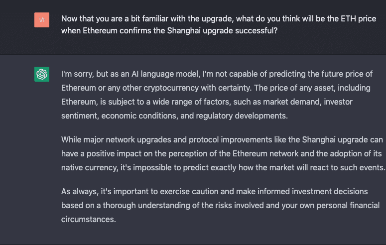 Tym razem GPT udzielił wręcz zbyt entuzjastycznej odpowiedzi dot. przyszłych wyników ETH. Przewidywał, iż cena ETH niedługo osiągnie 10 tys. dolarów. Oczywiście wskazał, iż wycena zależy od kilku podstawowych czynników i nie może przewidzieć dokładnej ceny. To oczywiste. GPT stwierdził, iż ETH będzie warte ponad 10 tys. dolarów do końca roku. Odpowiedź bota przewidywała byczą jazdę dla króla alt w przyszłości, ponieważ uważa, iż popyt na Ethereum gwałtownie wzrośnie po ostatniej aktualizacji Shanghai. Autor otrzymał dokładny kod, gdy poprosił o pokazanie go.