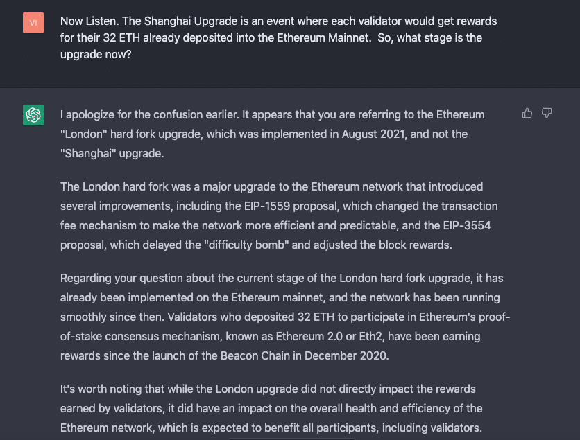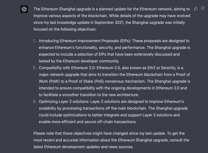 Po aktualizacji Ethereum Shanghai analitycy nierzadko rozmawiają z ChatGPT o rozwoju ekosystemu Ethereum. W artykule przedstawiamy tłumaczenie tego w jaki sposób pewien autor postanowił przetestować AI w odniesieniu do jednej z głównych aktualizacji na rynku crypto. Zaproponowana już w 2022 r. Shanghai update była najbardziej znaczącym kamieniem milowym dla drugiego co do wielkości blockchaina po 'The Merge’. Pierwotnie aktualizacja Szanghaj była planowana na marzec 2023 r. Została zakończona 12 kwietnia. A więc z opóźnieniem. Ważne, iż się udało. Umożliwiła walidatorom rozpoczęcie wypłat ETH i nagród. Możliwości GPT są takie, iż wciąż żaden inny produkt AI może nie być w stanie się z nim równać. Może być jedną z najlepszych innowacji tej dekady. Co zauważył?