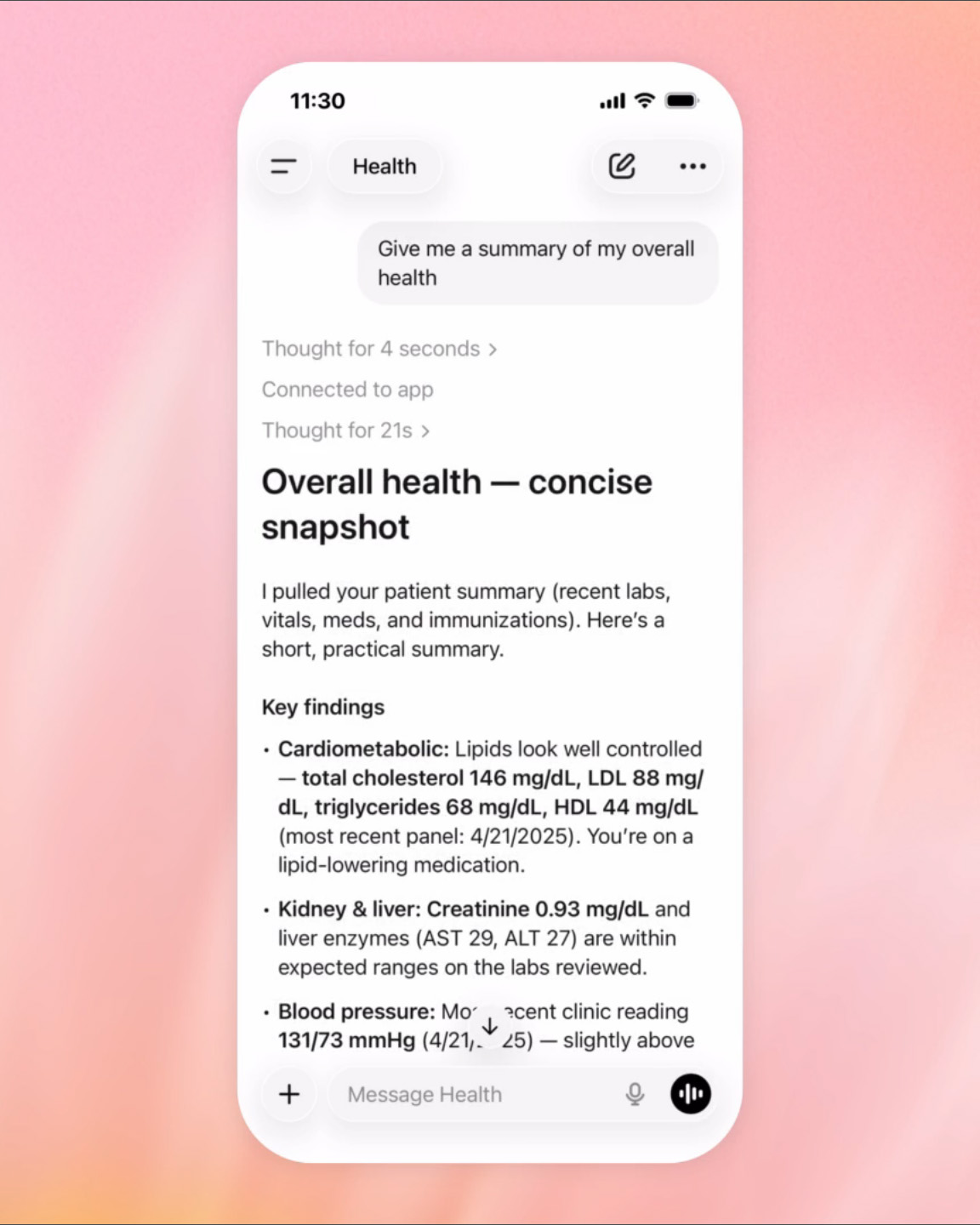 ChatGPT Health: „Przygotuj podsumowanie mojego ogólnego stanu zdrowia”Kluczowym elementem ChatGPT Health jest możliwość podłączania własnych danych. Użytkownicy mogą integrować elektroniczną dokumentację medyczną oraz aplikacje zdrowotne, takie jak Apple Health, MyFitnessPal, Weight Watchers czy Peloton, aby uzyskiwać bardziej spersonalizowane odpowiedzi. To z kolei ma się przełożyć na bardziej trafne odpowiedzi na zapytania dotyczące rozumienia wyników badań, przygotowania się do wizyty u lekarza, analizie danych o śnie czy aktywności fizycznej albo interpretacji zaleceń żywieniowych.