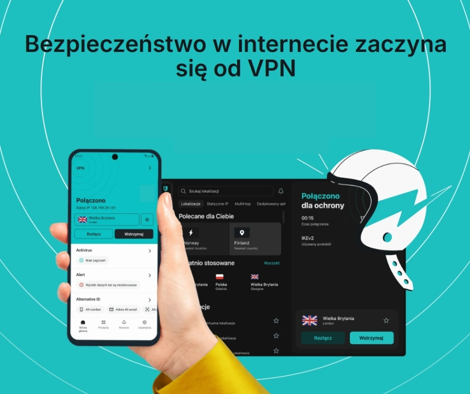 VPN jest fundamentem ochrony na poziomie transmisji. Usługa szyfruje ruch i ogranicza możliwość podglądu połączenia w sieciach, których nie da się kontrolować – szczególnie w publicznych punktach WiFi oraz w środowiskach współdzielonych. Dodatkowo VPN maskuje adres IP, co zmniejsza część profilowania opartego na lokalizacji i identyfikatorach sieciowych.