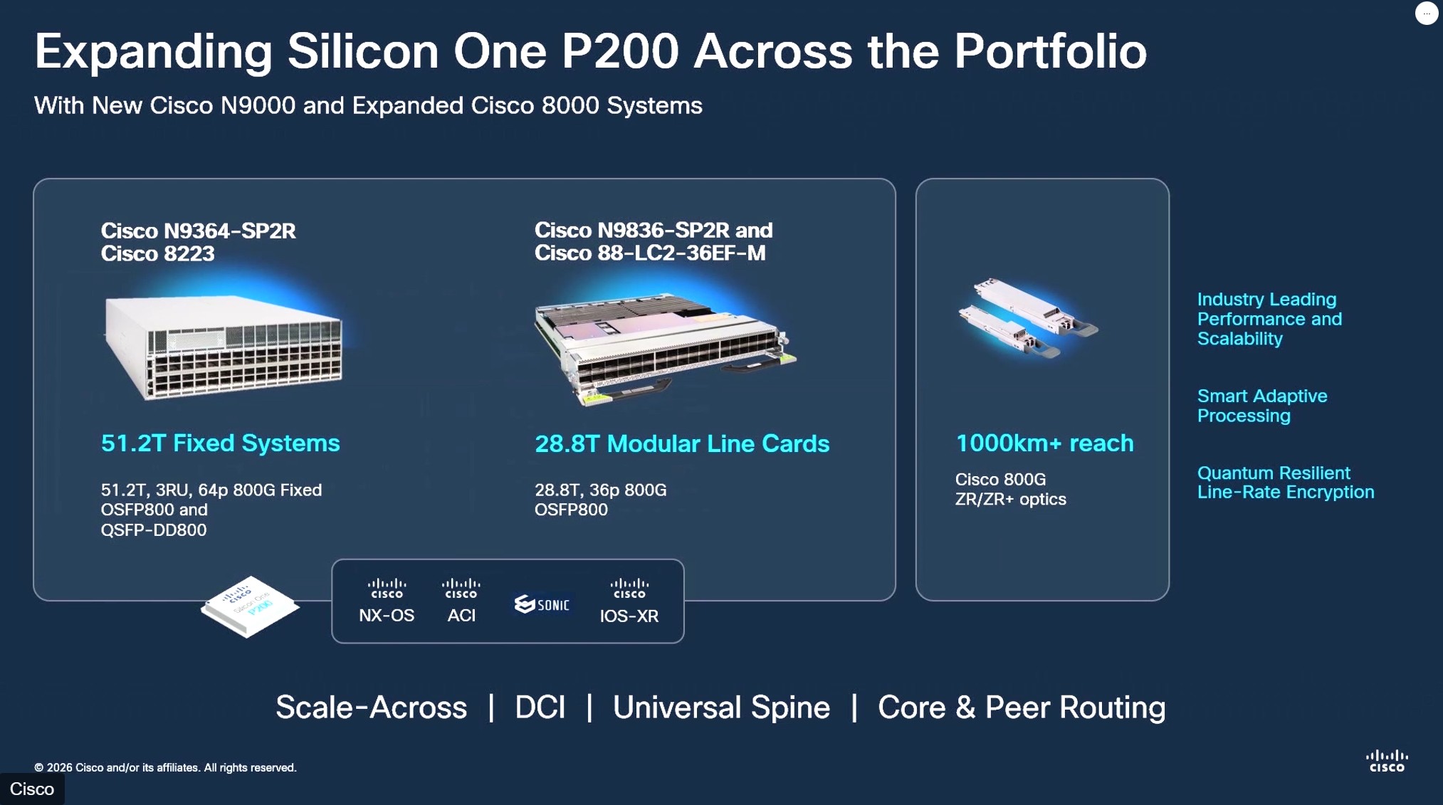 Jednak Cisco nie zapomniało o sieciach WAN i architekturach scale-out. Obok giganta G300, rozwinięto linię Silicon One P200 (51,2 Tbps). Nowe systemy oparte na P200, w tym modułowe karty liniowe 28.8T, są dedykowane do budowy rdzenia sieci i interkonektów centrów danych, oferując te same funkcje programowalne co ich więksi bracia.