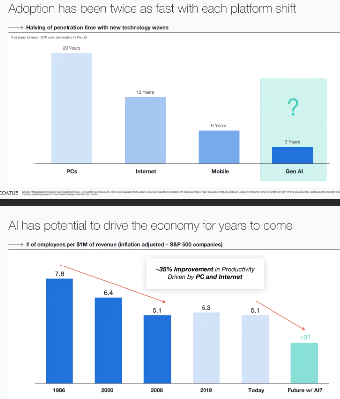 Coatue Management zarządza portfelem wartym blisko 70 mld USD. Analitycy funduszu wieszczą… Kontynuacje hossy technologicznej, która w ich ocenie znajduje się dopiero 'w powijakach’. W czasie gdy powszechna użyteczność sztucznej inteligencji dopiero się rodzi Coatue widzi niezliczone możliwości poprawy świata, które oferuje AI. Ponad 20 miliardów dolarów zainwestowanych w prywatne firmy zajmujące się sztuczną inteligencją – to wciąż za mało? Dane dotyczące przypadków użycia sztucznej inteligencji pokazują na rozwój technologii. W analizie fundusz podkreśla, iż programiści korzystający z GitHub Copilot wykonują zadania o 50% szybciej. Sztuczna inteligencja obniżyła koszty obsługi klienta dla jednej firmy choćby o 95% (przy szczęśliwszych użytkownikach i krótszych czasach reakcji).