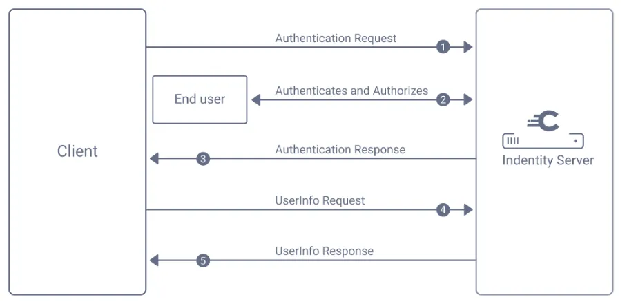 Proces typowej autoryzacji z OIDC przebiega następująco: klient wysyła żądanie do serwera tożsamości, ten uwierzytelnia użytkownika, a następnie zwraca ID token (oraz dostępowy/odświeżający, jeżeli są potrzebne). Klient może także pobrać więcej informacji o użytkowniku, korzystając z UserInfo endpoint. Poniżej schemat.