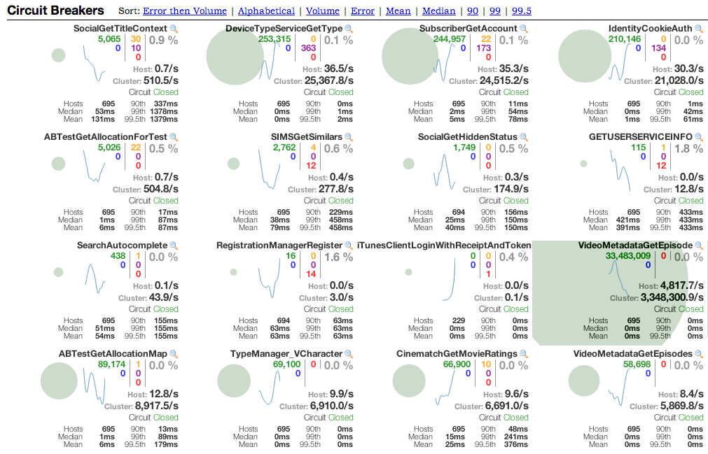 Hystrix oferuje jeszcze domyślny servlet, który generuje strumień statystyk odnośnie każdego rodzaju Hystrix’owej komendy. Widać go standardowo pod /hystrix.stream i maksymalnie 5 klientów może się pod niego podłączyć. W ładny sposób są te dane wizualizowane dzięki Hystrix Dashboard. Gdy chcemy na naszej "desce rozdzielczej" widzieć informacje z wielu miejsc, to dzięki Turbine możemy połączyć wiele strumieni w jeden i pod niego podłączyć dashboard. Przykładowy wygląd poniżej:
