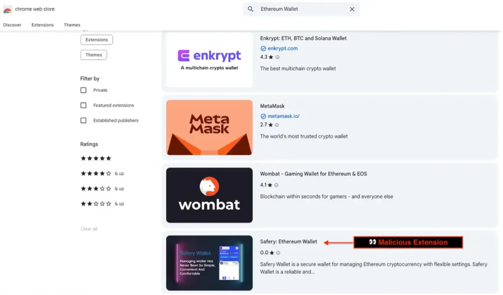 Badacze z Socket Security wykryli złośliwe rozszerzenie Chrome o nazwie „Safery: Ethereum Wallet”, które udaje legalny portfel ETH, a w rzeczywistości ma wbudowany backdoor służący do eksfiltracji fraz odzyskiwania (mnemonic seed).