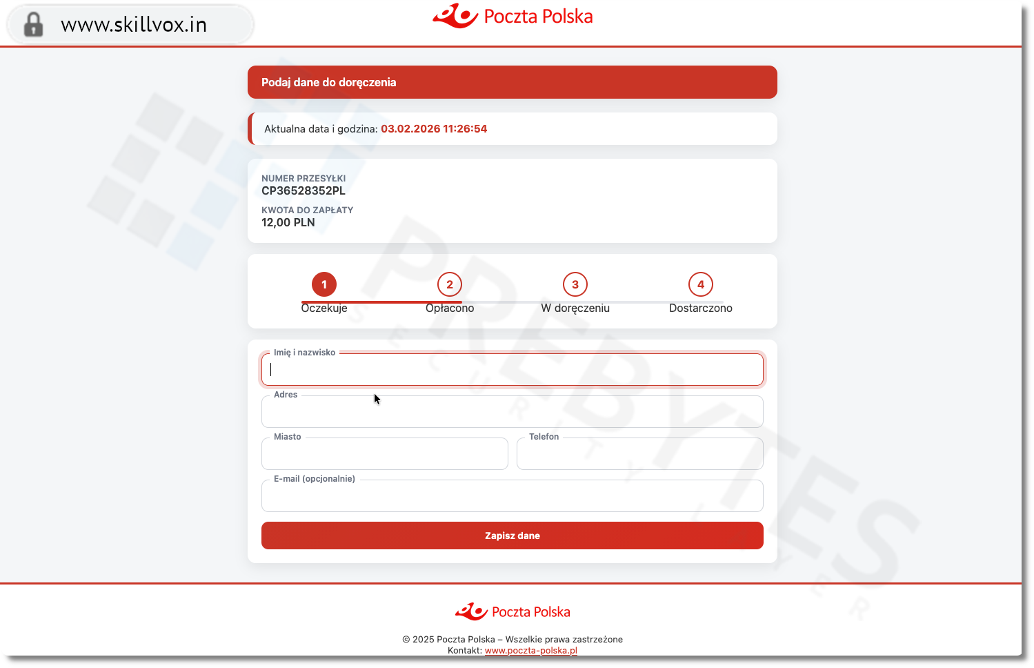 Link prowadzi do strony imitującej serwis Poczty Polskiej. Aby uregulować „dopłatę”, użytkownik proszony jest o podanie pełnych danych osobowych i adresowych.