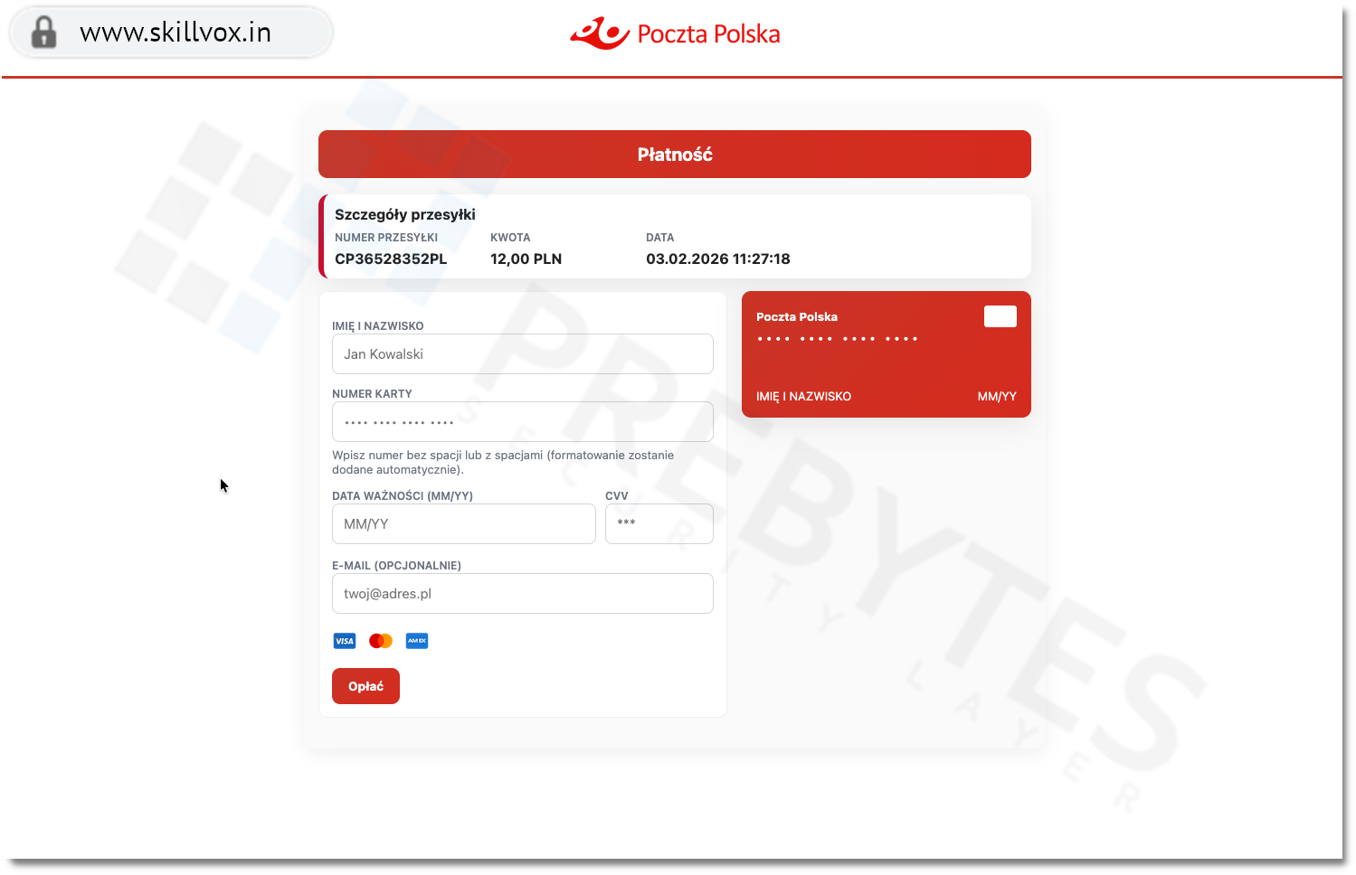 W efekcie pod pretekstem uiszczenia drobnej opłaty za przesyłkę oszuści w rzeczywistości wyłudzają dane kart płatniczych. Wprowadzone na fałszywej stronie dane, tj. numer karty, data ważności, kod CVV/CVC, a także kod autoryzacyjny SMS, trafiają bezpośrednio do przestępców. Ci natomiast mogą wykorzystać je do realizowania nieautoryzowanych operacji finansowych, np. zakupów online, aktywowania subskrypcji czy innych transakcji bez wiedzy właściciela karty.
