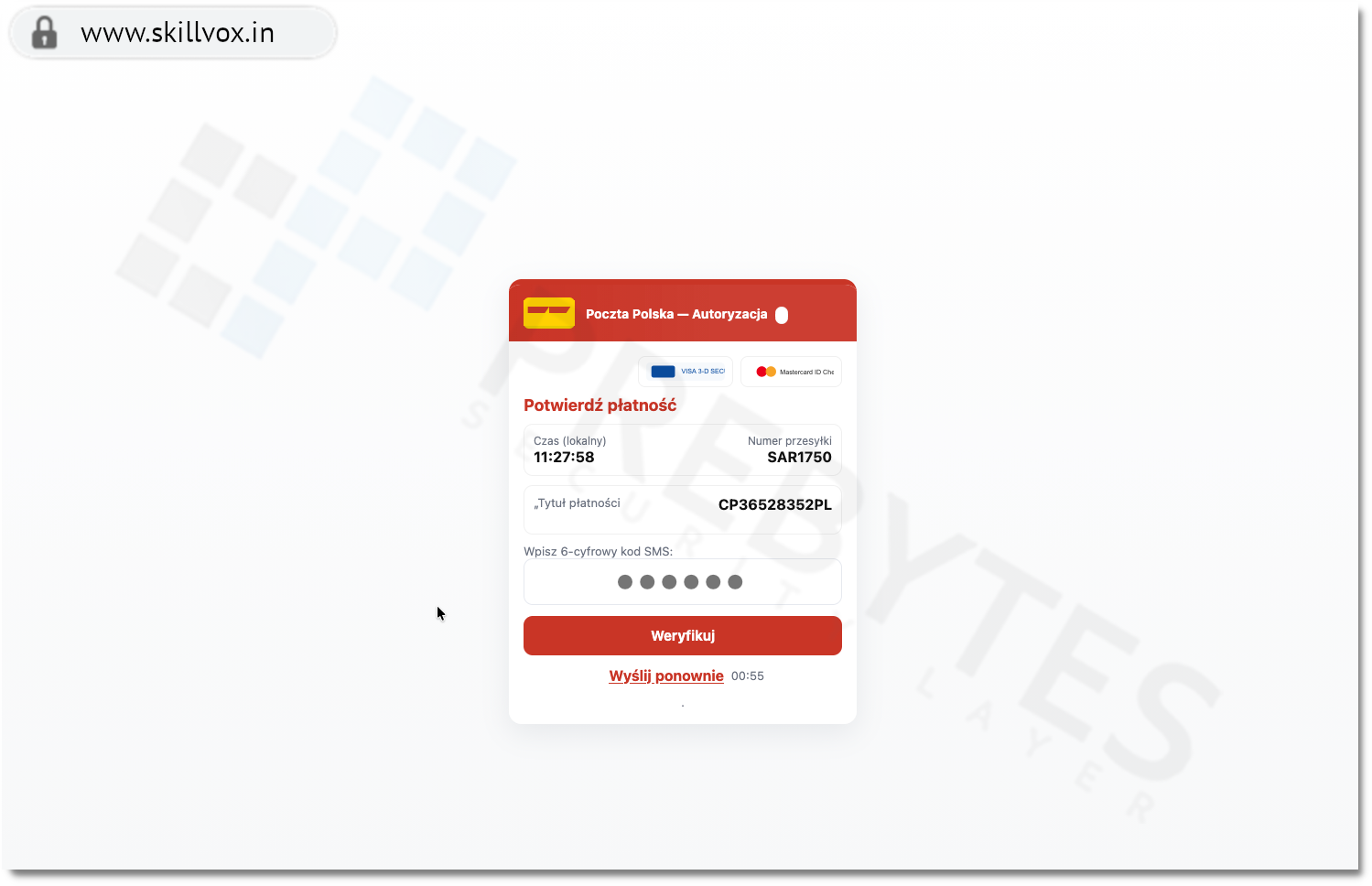 Na fałszywej stronie znajduje się formularz wymagający podania danych osobowych i adresowych. Następnie użytkownik jest przekierowywany do etapu wyłudzenia danych karty płatniczej oraz kodu autoryzacyjnego SMS.