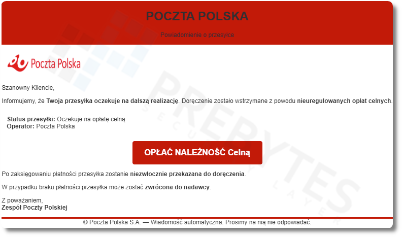 Atak rozpoczyna się od wiadomości e-mail, której rzekomym nadawcą jest Poczta Polska. Użytkownik jest informowany o wstrzymaniu przesyłki z powodu nieuregulowanych opłat celnych. Treść wiadomości przypomina standardowy komunikat systemowy, co zwiększa prawdopodobieństwo kliknięcia w przesłany przez cyberoszustów link, bez uprzedniej weryfikacji.