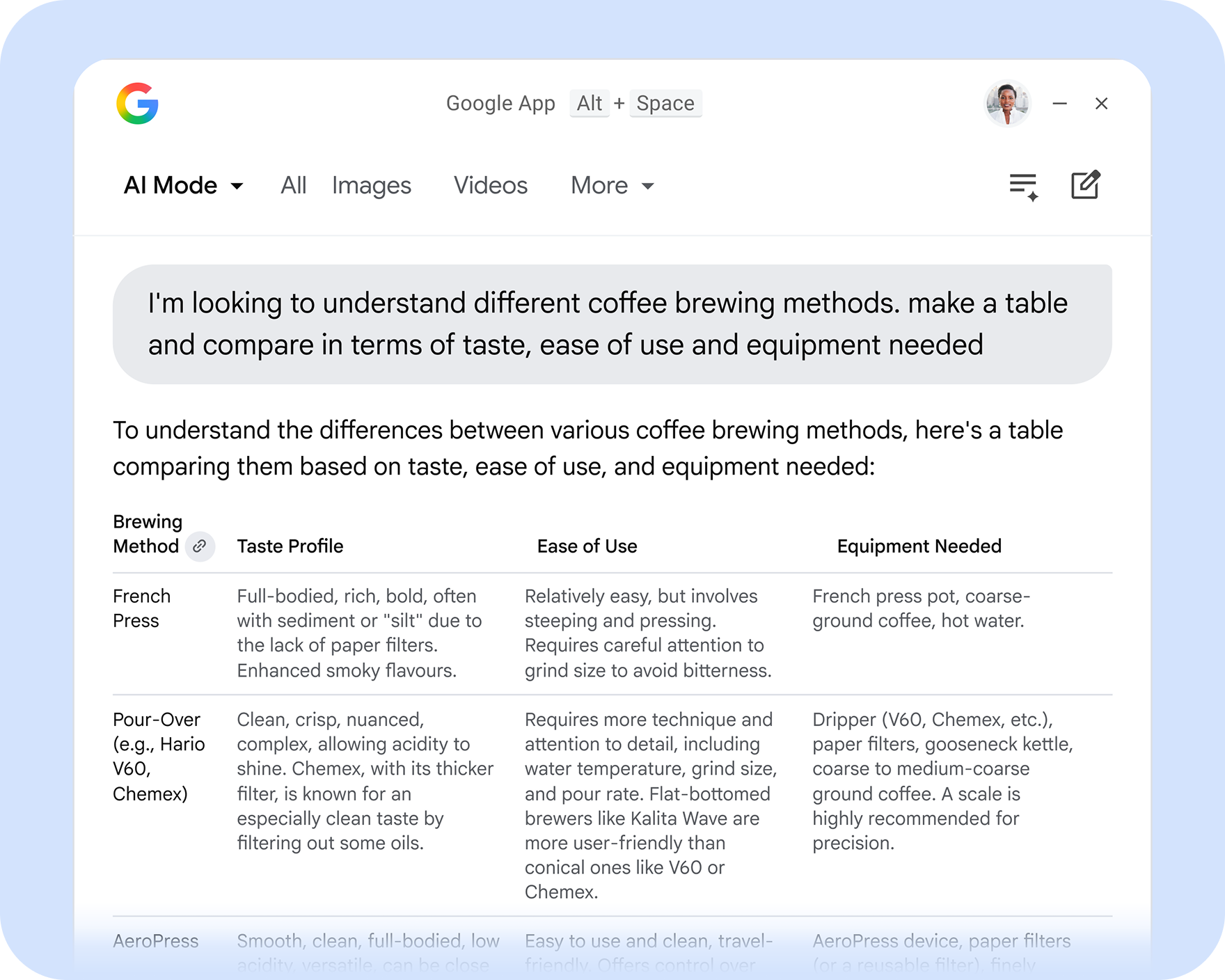 Wyniki wyszukiwania nie otwierają się w Chrome, Edge’u ani żadnej innej przeglądarce. Pojawiają się w pływającym oknie, które można przesuwać po ekranie. To drobiazg, ale bardzo zmienia sposób pracy – nie trzeba żonglować kartami, a odpowiedzi są zawsze „nad” tym, co robisz. Interfejs jest mocno inspirowany mobilną aplikacją Google.
