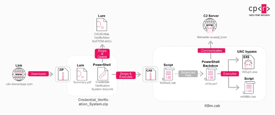 Specjaliści Checkpoint zauważyli, iż ataki tej kampanii zaczynają się od przekierowań phishingowych i linków umieszczonych na Discordzie lub podobnych platformach. Ofiary – głównie inżynierowie i deweloperzy blockchain z regionu Azji-Pacyfiku, w tym Japonii, Indii oraz Australii – otrzymują link prowadzący do ZIP-a, który zawiera pozornie nieszkodliwy PDF oraz złośliwy skrót (LNK). Po kliknięciu skrót uruchamia PowerShell loader, który wydobywa i instaluje kolejne komponenty ataku: dokument Word (DOCX), archiwum CAB oraz pliki batch wykorzystywane do eskalacji ataku i wzmocnienia jego trwałości.