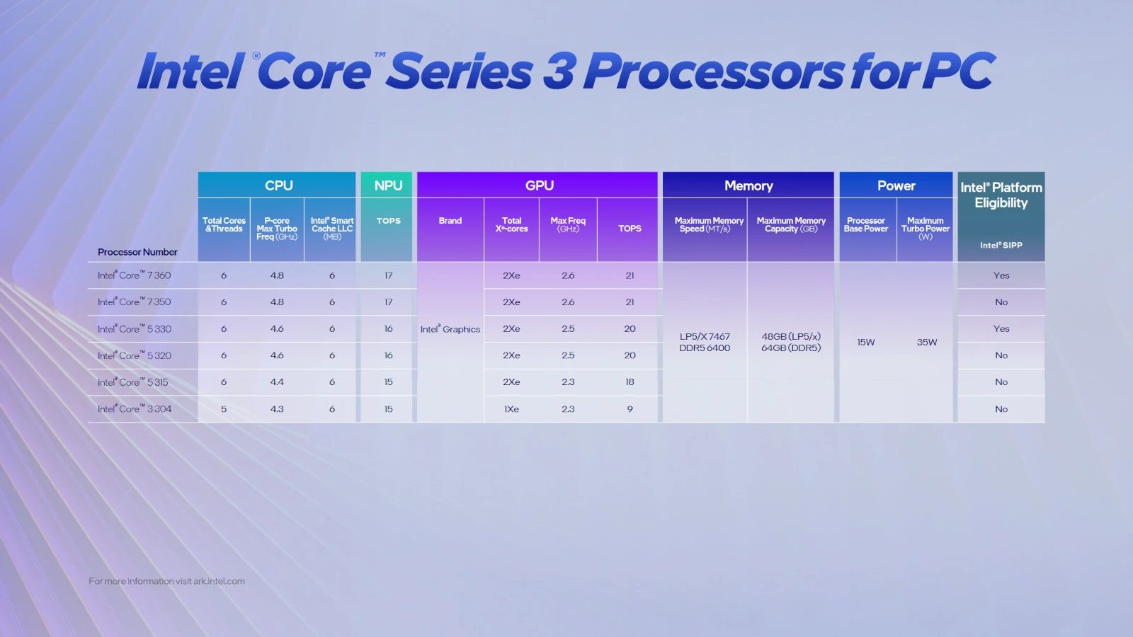 Układy oparto o architektury Cougar Cove (rdzenie P), Darkmont (rdzenie E) i Celestial (iGPU), a dopełnia to NPU 5. generacji. Postawiono także na najnowszą litografię Intel 18A. Dla segmentu konsumenckiego przygotowano sześć różnych modeli w segmentach Core 7, Core 5 i Core 3. Flagowiec oferuje 6-rdzeni z taktowaniem do 4,8 GHz, 6 MB pamięci podręcznej i układ graficzny z 2 jednostkami Xe3. Wszystko to przy TDP rzędu 15-35 W.