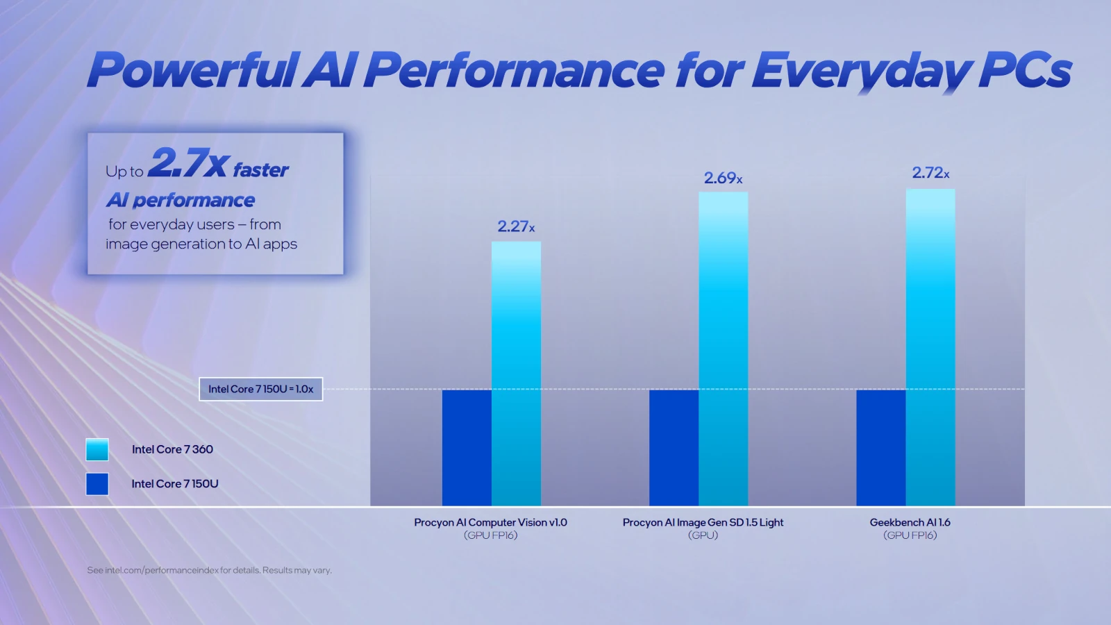 Z oceną wydajności trzeba poczekać do pierwszych niezależnych recenzji. Jednak według oficjalnych slajdów omowa o 10-211% lepszych osiągach w codziennej pracy. W zadaniach AI poprawa ma sięgać choćby 2,7x, przynajmniej zestawiając Intel Core 7 360 z Intel Core 7 150U.