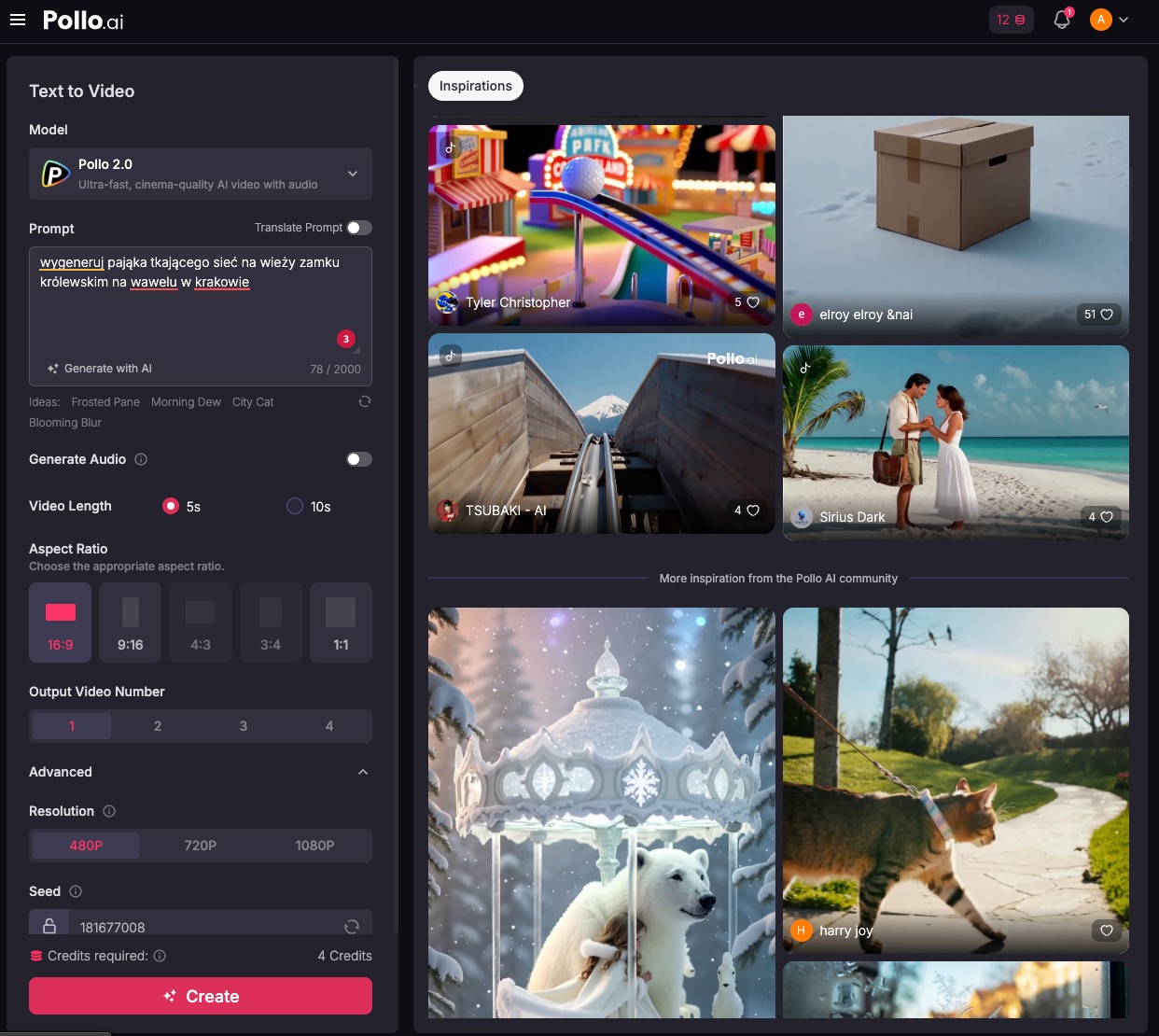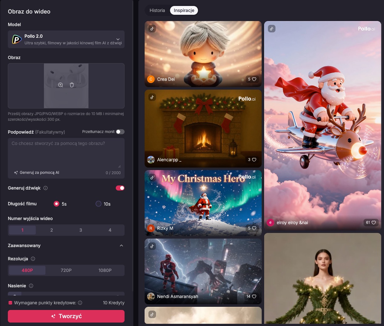 - wybrać model sztucznej inteligencji – w darmowej wersji mamy np. Pollo 2.0;