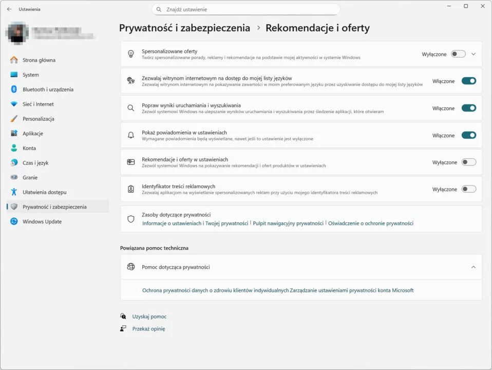 Microsoft eksperymentuje z rekomendacjami w Menu Start i pasku zadań. Aby ograniczyć reklamy i podpowiedzi: otwórz Ustawienia > Prywatność i zabezpieczenia > Rekomendacje i oferty i wyłącz opcje typu Spersonalizowane oferty, Identyfikator treści reklamowych i Rekomendacje i oferty w ustawieniach.