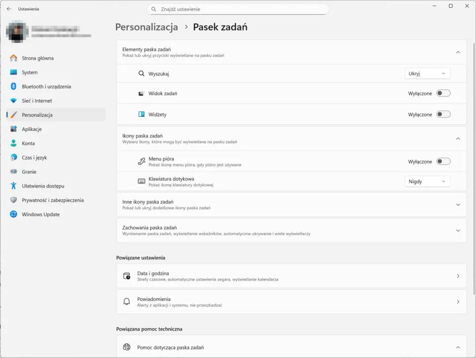 Ustawienia paska zadań w Windows 11Dodatkowo wejdź w Ustawienia paska zadań i wyłącz Widżety, a w Personalizacja > Ekran blokady zmień tło z Centrum uwagi Windows na Obraz i odznacz „Wyświetlaj na ekranie blokady porady, ciekawostki…”. To ustawi stałe tło na ekranie blokady, jak w starej, dobrej siódemce.