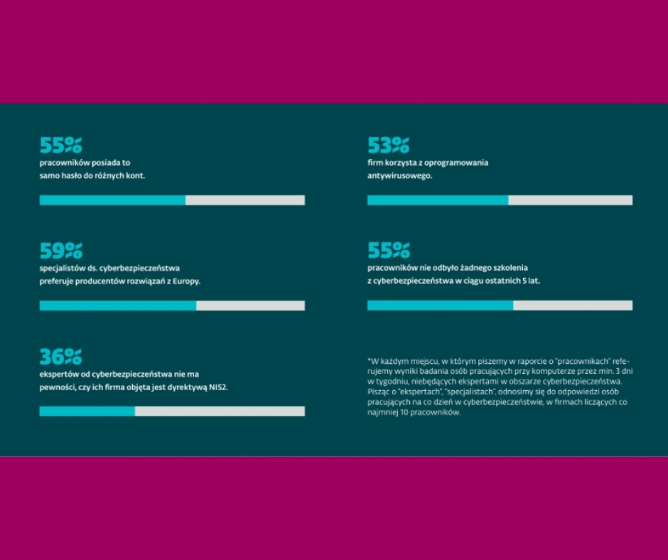 Z Cyberportretu polskiego biznesu opracowanego przez firmę ESET i DAGMA Bezpieczeństwo IT wynika, iż 55 proc. pracowników nie uczestniczyło w żadnym szkoleniu z cyberbezpieczeństwa w ciągu ostatnich 5 lat, 17 proc. osób, które doświadczyły incydentu, nie zgłosiło go nikomu, a tylko 53 proc. firm wskazuje antywirusa jako podstawowy mechanizm ochrony, podczas gdy MFA stosuje 38 proc. organizacji.