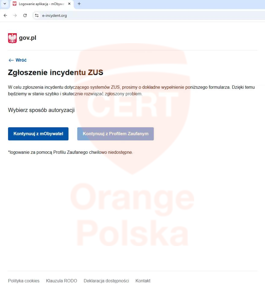 Rys. Strona phishingowa z nagłówkiem „Zgłoszenie incydentu ZUS”.