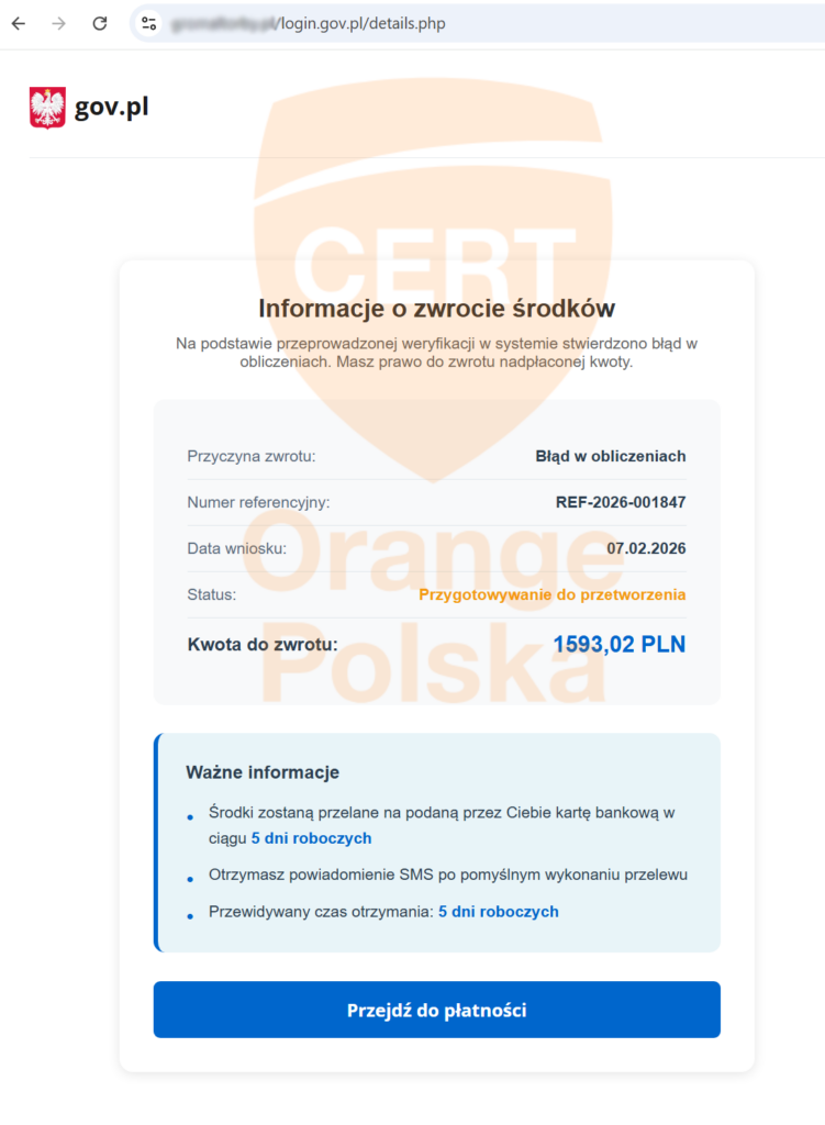 W zeszłym tygodniu informowaliśmy o kampanii SMS-ów informujących o możliwym do otrzymania zwrocie podatku. W wiadomościach występujących w różnych wariantach znajdował się link do strony w domenie bezpieczny-zwrot-podatku[.]com, na której znajdował się panel phishingowy. Ta strona nie była jednak wierną kopią paneli logowania lub formularzy znanych ze stron rządowych, a połączeniem kilku elementów graficznych związanych ze stronami w domenie gov.pl. Pierwszym etapem do uzyskania rzekomego zwrotu podatku miało być przekazanie danych osobowych i adresowych. Drugim, mającym na celu wyłudzenie danych dostępowych do bankowości elektronicznej, było „uwierzytelnienie bankowe” przenoszące użytkownika na stronę imitującą logowanie do wybranego banku. Szczegóły tego oszustwa przedstawialiśmy w naszym artykule.