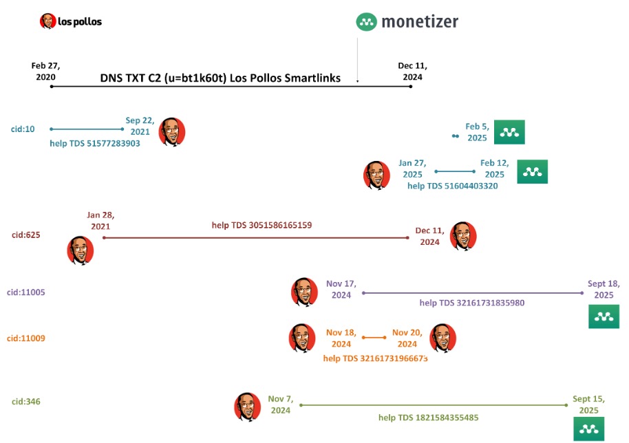 Dla rozprzestrzeniania treści zewnętrznych operatorzy wykorzystują rozmaite redirectory i systemy pośredniczące, a więc w praktyce odpowiedzi TXT często zawierały domeny-redirectory, które kierowały dalej do tzw. Help TDS (Traffic Distribution System) lub bezpośrednio do hostów stagingowych. Detour Dog manualnie tworzy i przenosi identyfikatory śledzące pomiędzy różnymi TDS-ami, dzięki czemu można połączyć rozproszone aktywności i śledzić łańcuchy przekierowań przez długi czas. Taki atak łączy kompromitowane witryny z globalnym ekosystemem TDS/affiliate, co umożliwia szerokie maskowanie i monetyzację ruchu, albo jego przekierowanie na bardziej złośliwe ładunki, gdy warunki są sprzyjające.