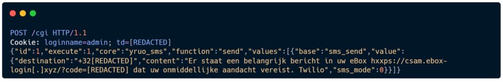 Atakujący skupili się na modelach marki Milesight w celu wysyłania wiadomości SMS z linkami phishingowymi. W tym celu wykorzystywali lukę lub błędną konfigurację API routerów, które udostępniają endpoint /cgi, obsługujący operacje typu send_sms, query_outbox, query_inbox. W niektórych przypadkach funkcje te są dostępne bez uwierzytelnienia, co umożliwia atakującemu wykonywanie żądań HTTP POST z odpowiednim payloadem JSON zawierającym numer odbiorcy i treść wiadomości.