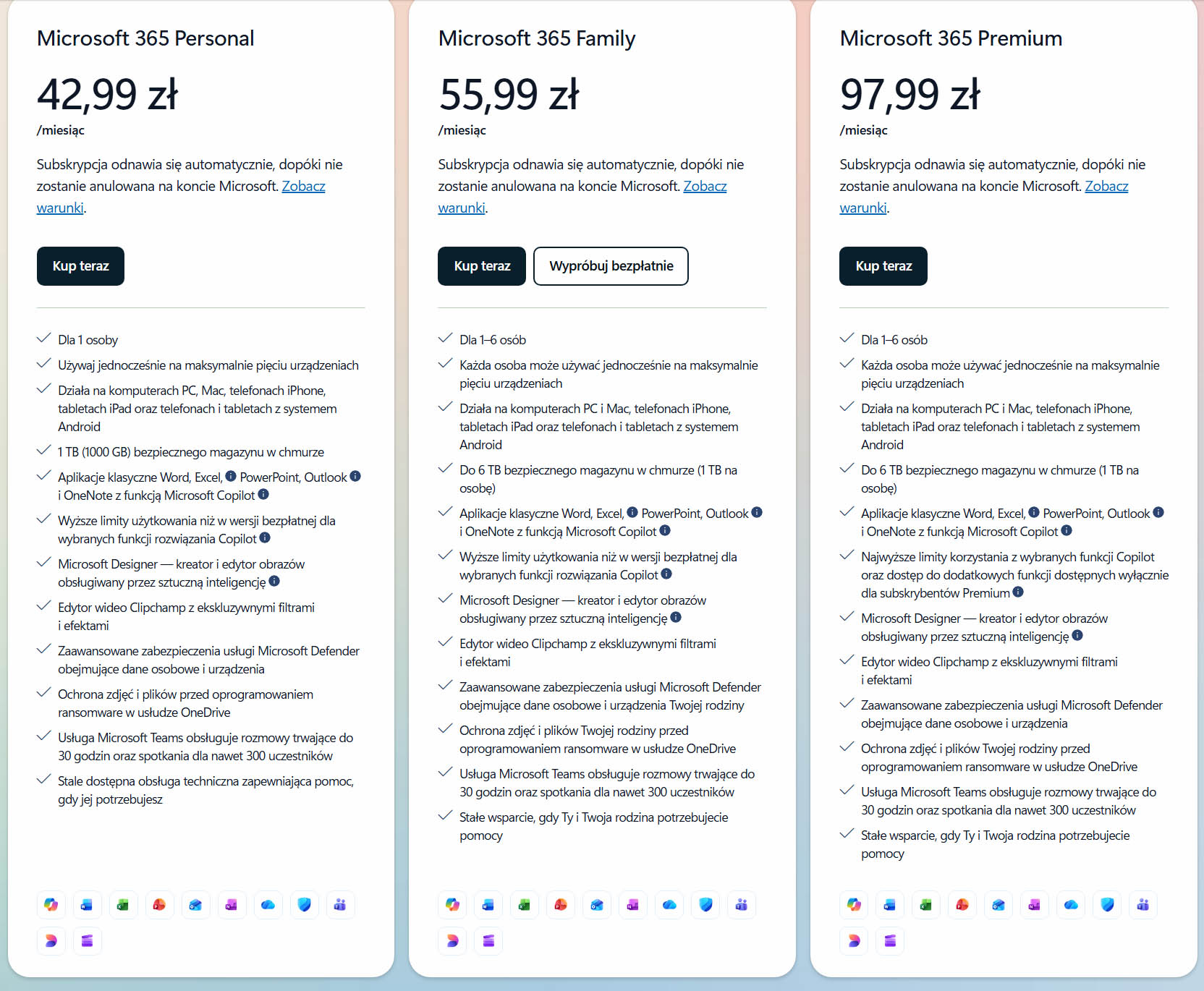 Cennik Microsoft 365W ofercie Microsoftu najbardziej interesującą propozycją (aczkolwiek już nie budżetową) jest najdroższy plan – Microsoft 365 Premium. Jest on fuzją powstałą z połączenia Microsoft 365 Premium oraz Copilota Pro, dzięki czemu jego posiadacze – oprócz możliwości dzielenia się pakietem Office i przestrzenią w chmurze OneDrive – zyskują także najwyższe limity i dodatkowe funkcje Copilota. Microsoft 365 Premium kosztuje tyle, co ChatGPT Plus.