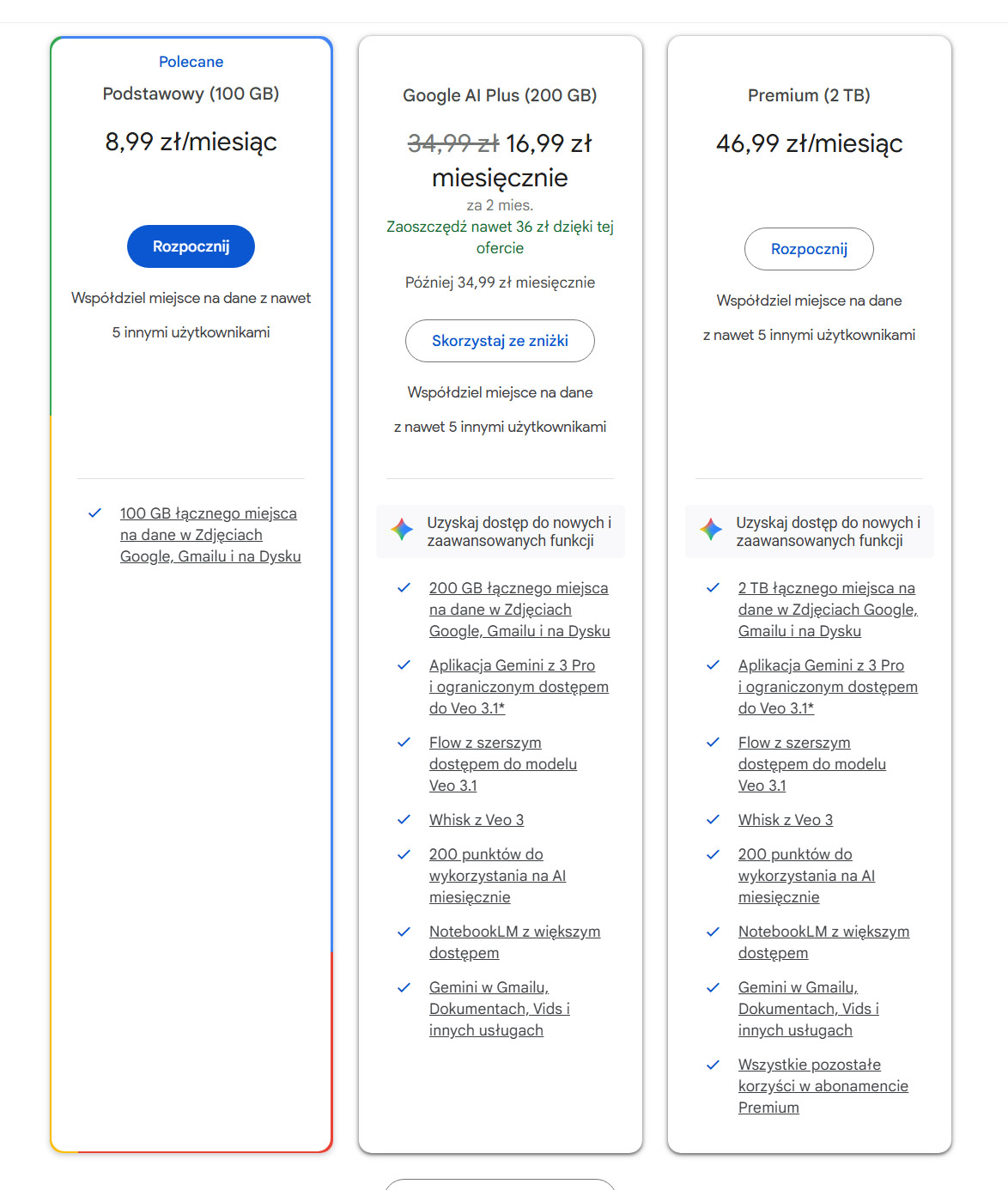 Cennik Google AIDodatkowo Google dorzuca 200 GB miejsca na dysku Google – o 185 GB więcej w porównaniu do darmowego planu, możliwe do współdzielenia.
