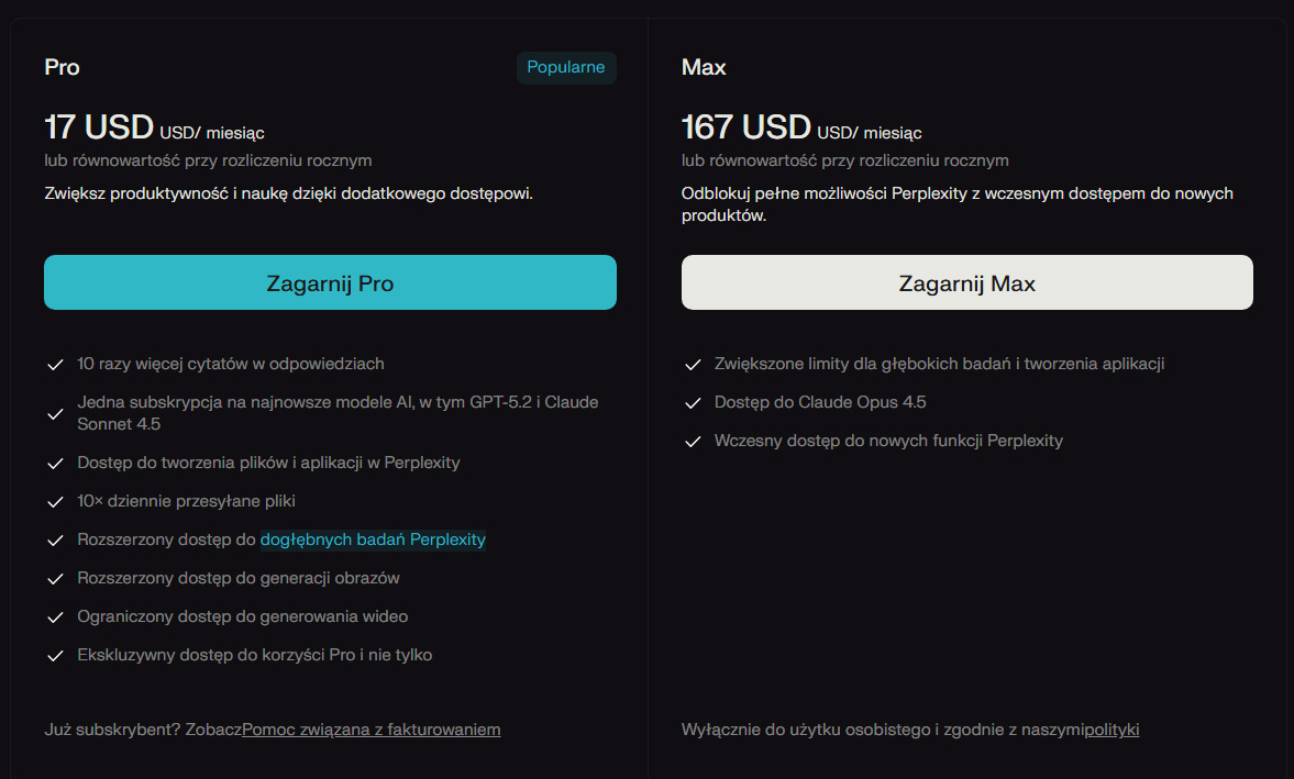 Perplexity AI jest pierwszą firmą w zestawieniu, która nie oferuje „taniego” wariantu. Opcje subskrypcyjne są tylko dwie: Pro (17 dolarów/mies – ok. 60 zł) lub Max (167 dol./mies – 585 zł) – obie ceny przy rozliczeniu rocznym, w innym przypadku 20 dol./mies i 180 dol./mies. Perplexity Pro daje możliwość nieograniczonego korzystania z odpowiedzi Pro (w wariancie darmowym jest to 3 na dobę), a odpowiedzi Pro mają więcej cytatów i mogą korzystać z większej liczby modeli. Użytkownik zyskuje możliwość tworzenia plików i aplikacji w Perplexity, może przesyłać więcej plików, a także rozszerza mu się dostęp do dogłębnych badań Perplexity, generowania obrazów i wprowadza możliwość generowania wideo.