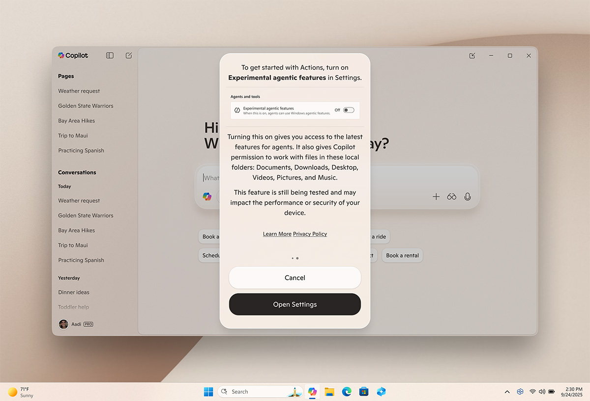 Potrzebujesz pomocy w sortowaniu zdjęć z ostatnich wakacji? Chcesz wyciągnąć informacje z PDF? Copilot Actions może wykonać ciężką pracę za ciebie, bazując na kontekście tego, co znajduje się na twoim PC. Wystarczy opisać zadanie własnymi słowami, a agent spróbuje je wykonać, wchodząc w interakcję z aplikacjami desktopowymi i webowymi.