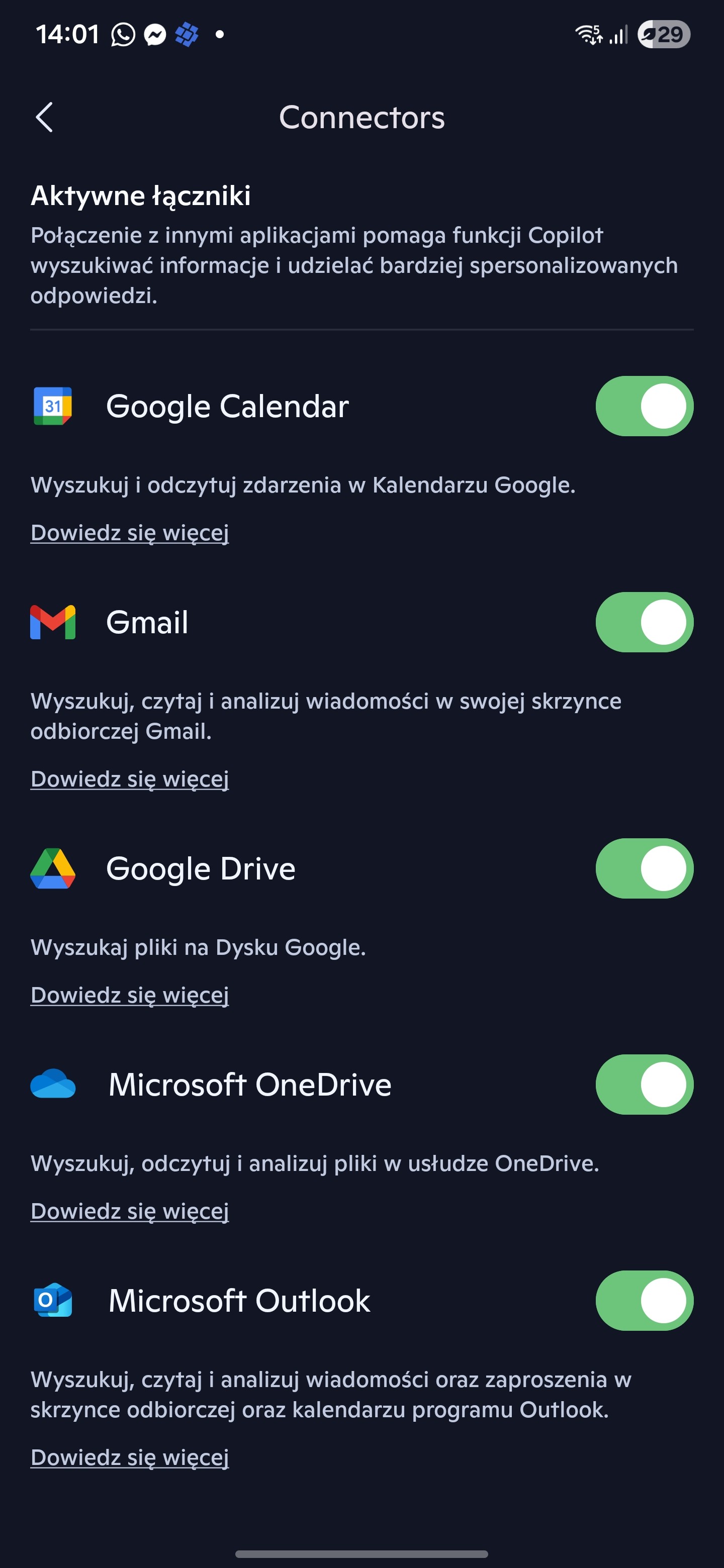 Copilot w Windowsie 11 zyskuje także funkcję łączników (connectors), które pozwalają podłączyć ulubione usługi bezpośrednio do aplikacji. Użytkownicy mogą połączyć pliki OneDrive, kontakty, e-maile i wydarzenia w kalendarzu Outlook, a także usługi Google’a – Dysk Google, Gmail, Kalendarz Google i Kontakty Google.