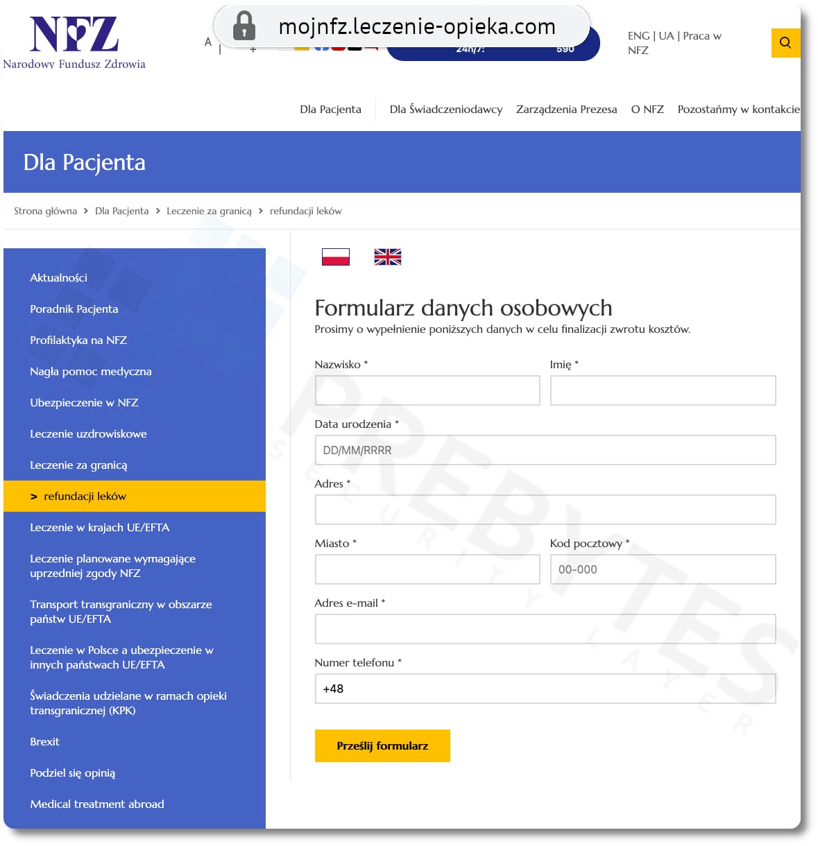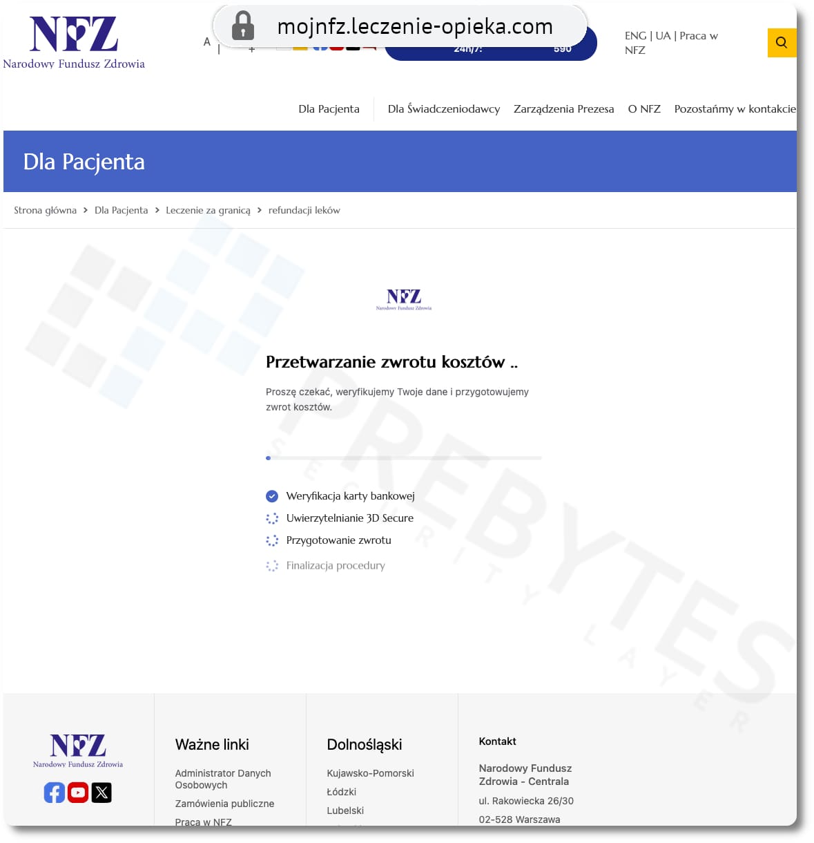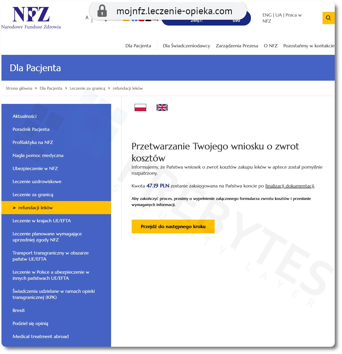 Jak przebiega schemat ataku pokażemy na przykładzie fałszywej strony, która podszywa się pod portal NFZ. W pierwszej kolejności pojawia się najczęściej panel logowania lub, jak w tym wypadku, podsumowanie z widoczną kwotą do zwrotu - czyli znów klikalny przycisk “Przejdź do następnego kroku”.