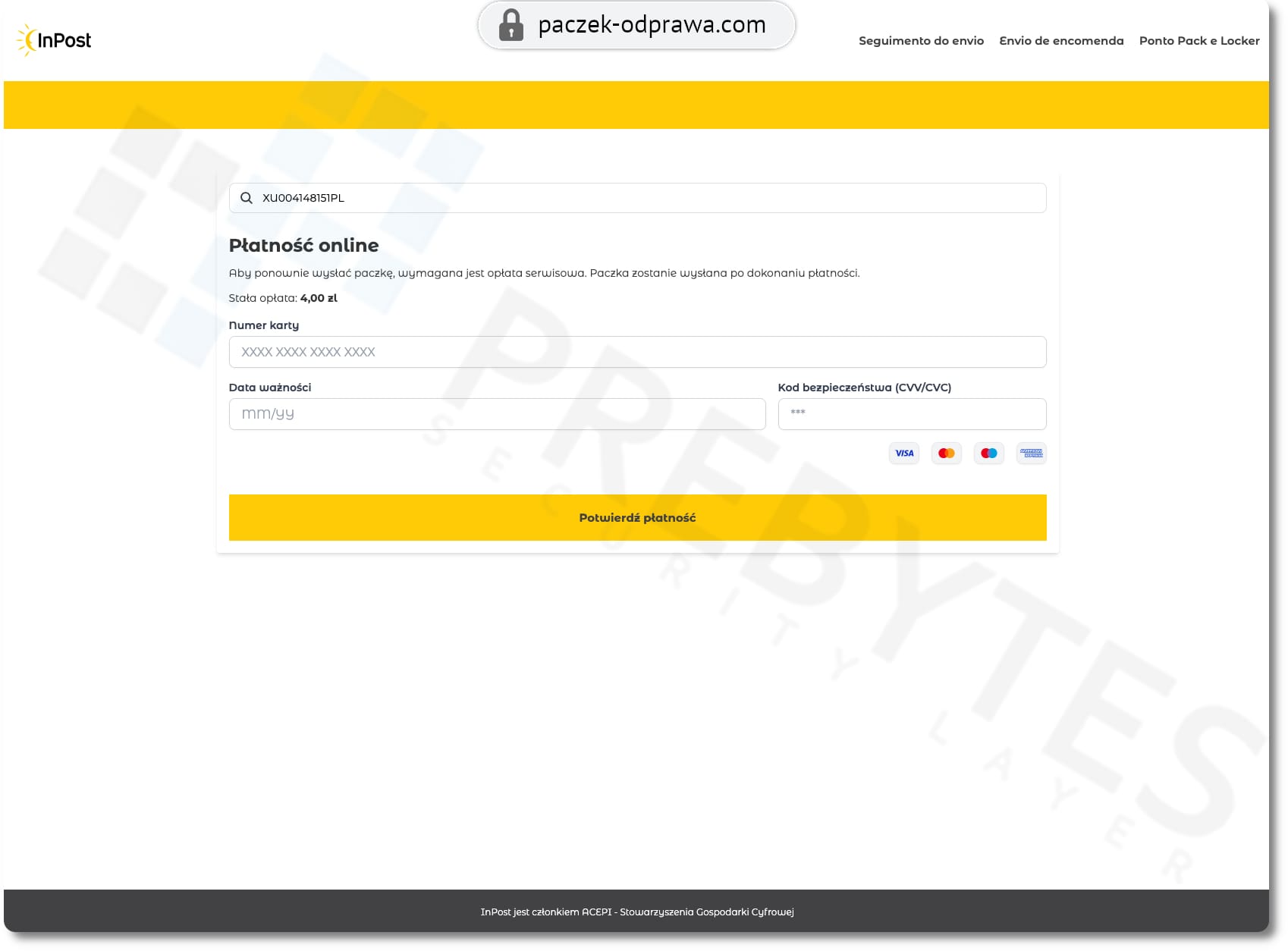 Fałszywa strona podszywająca się pod InPost, na której wyłudzane są dane kart: