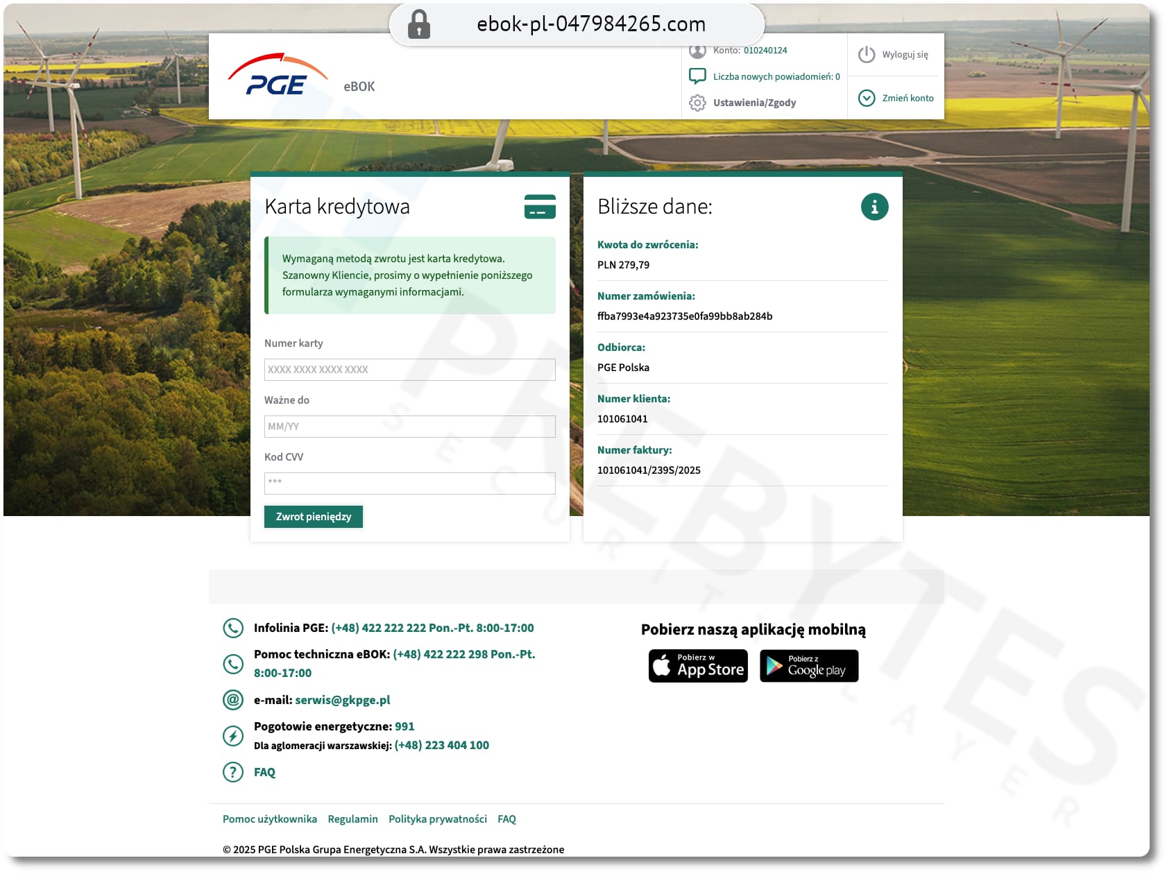 Analogiczny atak jest przeprowadzany na Klientów PGE. W tym scenariuszu również cyberprzestępcy chcą pozyskać dane kart płatniczych: