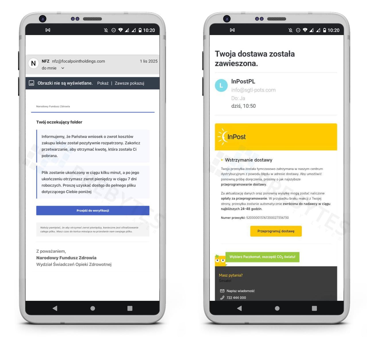 Jak pokazują przykłady, wiadomości SPAM wizualnie często do złudzenia przypominają oryginalne wiadomości serwisów, pod które się podszywają - w tym przypadku InPost oraz NFZ.