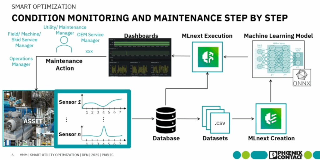 Jednym z najciekawszych i najbardziej praktycznych narzędzi do tego typu zastosowań jest MLnext – otwarte środowisko opracowane przez Phoenix Contact, które pozwala łatwo wdrożyć analitykę AI w środowisku przemysłowym (np. w maszynie lutowniczej, prasie, zgrzewarce, sprężarce itp.).