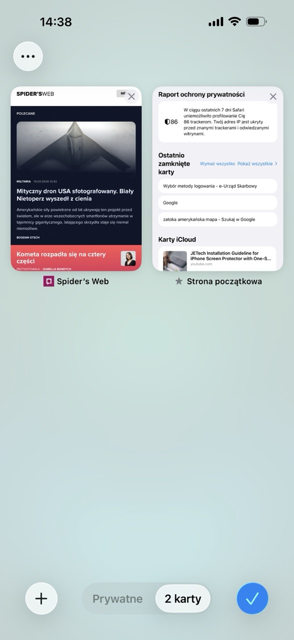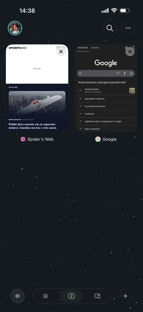 Kolejną inspirację możemy zauważyć na ekranie kart – układ jest taki sam i polega na oknach wyświetlanych w formie siatki z dwiema stronami tuż obok siebie. Ekran ten pozwala też uruchamiać nowe, zwykłe karty oraz karty incognito. W Perplexity Comet mamy do dyspozycji funkcję synchronizacji kart z innych urządzeń, co w moim odczuciu zostało rozwiązane w sposób bardziej przyjazny dla użytkownika – w Safari zsynchronizowane karty znajdują się dopiero po otwarciu nowej karty, tuż pod zakładkami.
