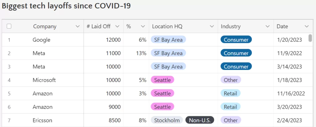 W zwolnieniach branży tech przodują firmy BigTech jak Google, Meta, Microsoft i Amazon. Źródło: layoffs.fyiRóżnica w jakości?