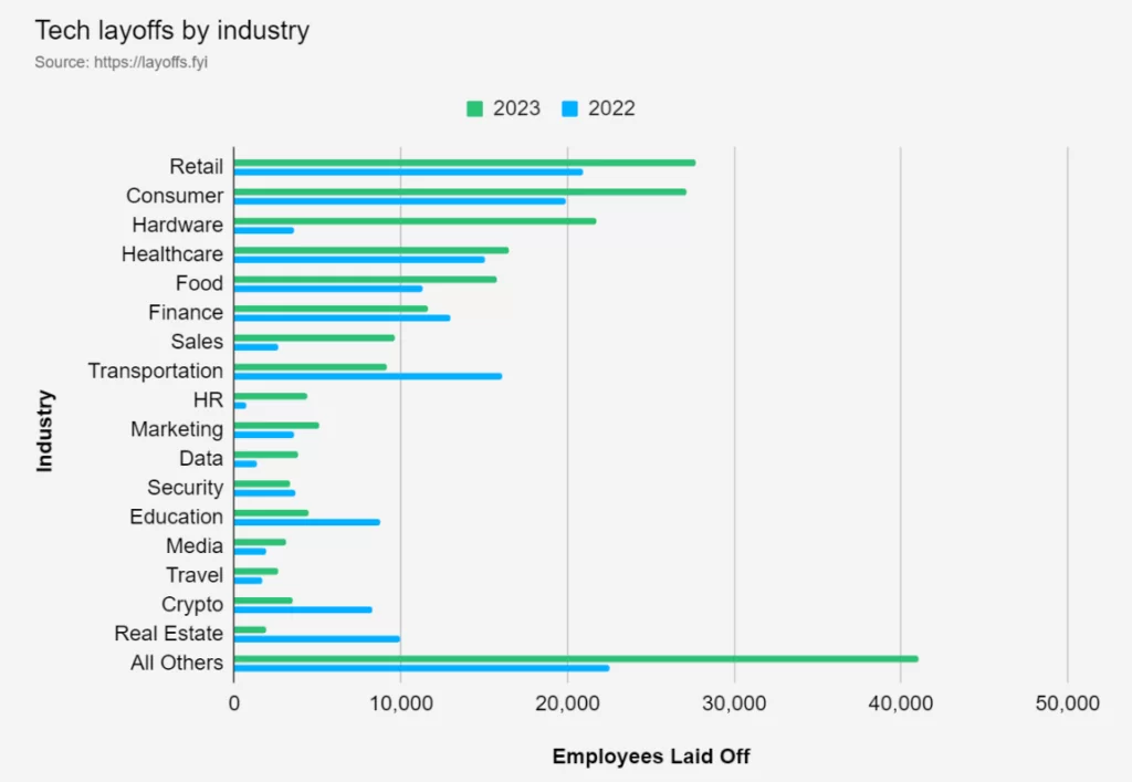 Skala zwolnień w 2022/2023 potężnie przebiła rok 2022. Źródło: Layoffs.fyiWięcej za mniej?
