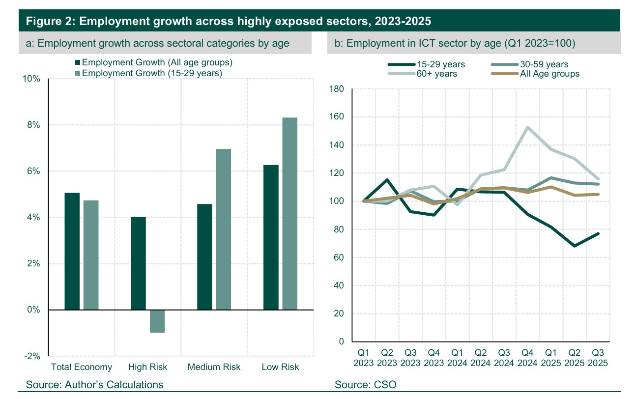 Zatrudnienie według grup wiekowych, zmiana procentowaIrlandia to jedno z najbardziej zdigitalizowanych państw w Europie, z ogromnym udziałem sektora ICT i finansów w gospodarce oraz silną obecnością globalnych gigantów technologicznych. Według rządowych analiz irlandzki rynek pracy jest „wyjątkowo mocno wystawiony” na wpływ AI – zarówno jeżeli chodzi o liczbę zawodów, które można częściowo zautomatyzować, jak i tempo adopcji nowych narzędzi.